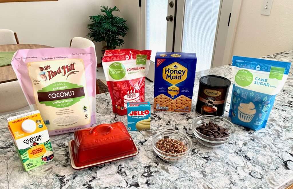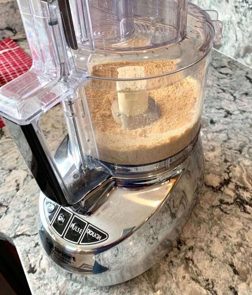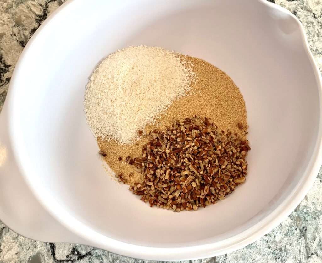 Remove from the heat and stir in graham cracker crumbs, chopped pecans, and coconut until the mixture is well combined and resembles “wet sand.”