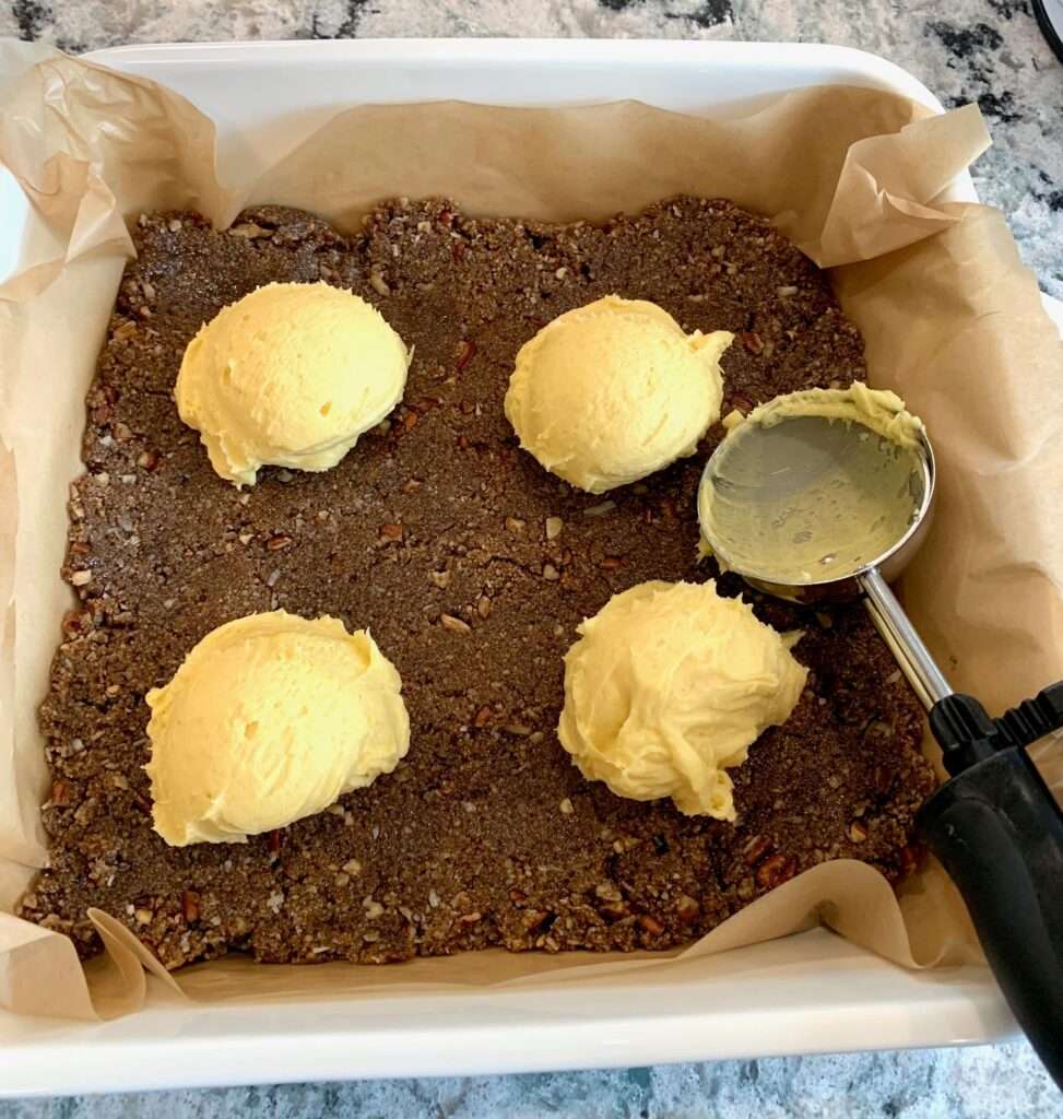 Pull the baking pan with the bottom layer out of the refrigerator. Using a scoop, place the vanilla buttercream on top of the bottom mixture. With a knife, create an even layer of buttercream. Transfer the pan to the refrigerator and chill for at least a half hour.
