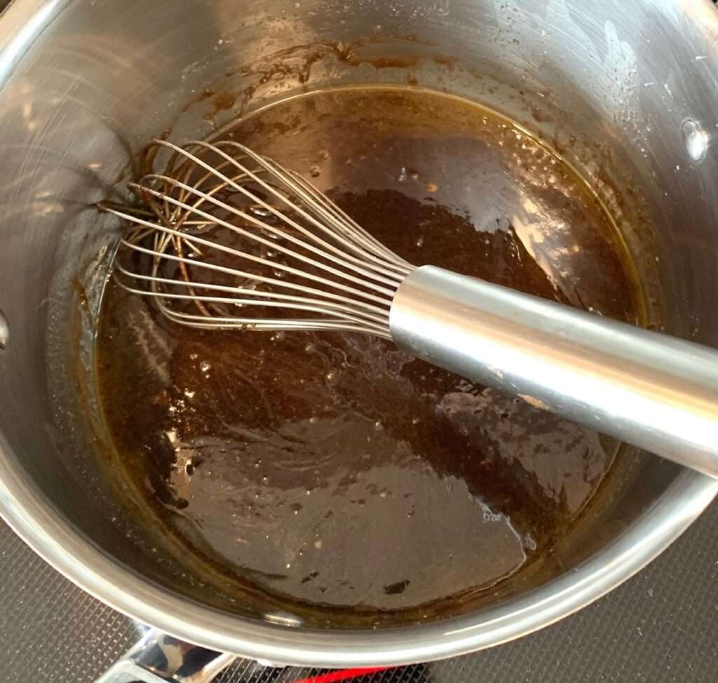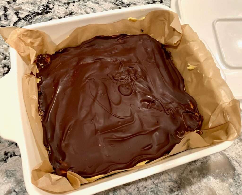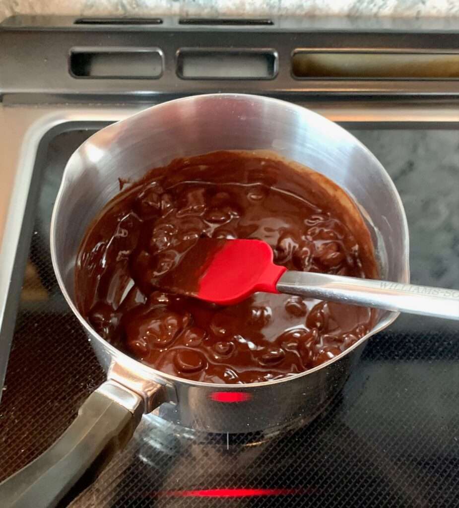 Prepare the top layer: In a small saucepan over low heat, melt the chocolate and butter stirring often. It is finished when the mixture has melted and is evenly combined.