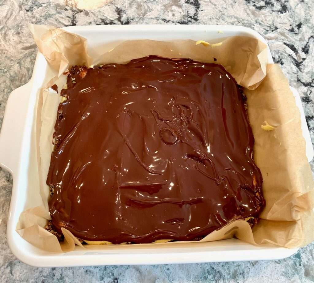 Pull the pan out of the refrigerator. Spread the chocolate evenly over the butter cream using a spatula.