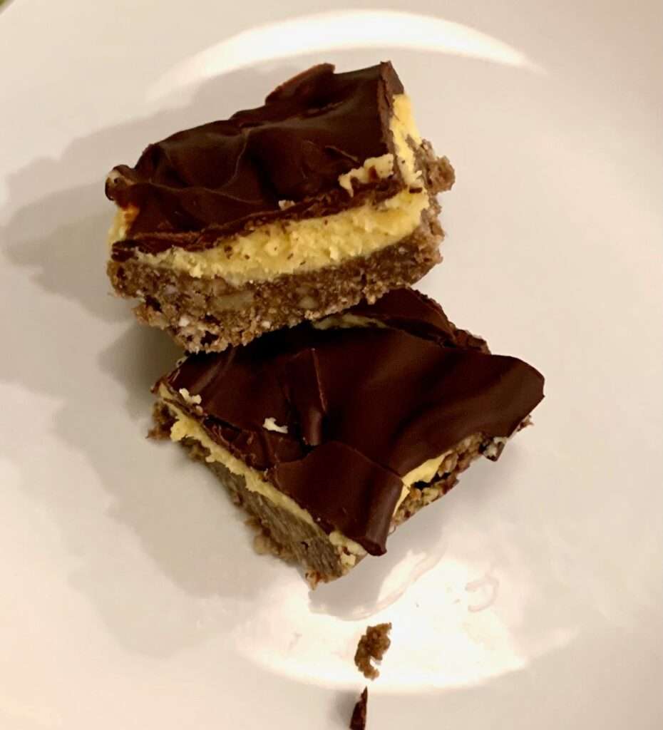These bars are called a “triple threat” because each layer is good on its own, but the three layers of graham cracker mixture, vanilla buttercream and chocolate ganache hit the ball right out of the park. We learned about the Nanaimo bars while on our first cruise with our boat to British Columbia. The bars are a big deal all over Canada. They are found in most bakeries and for any occasion including high tea and large celebrations.