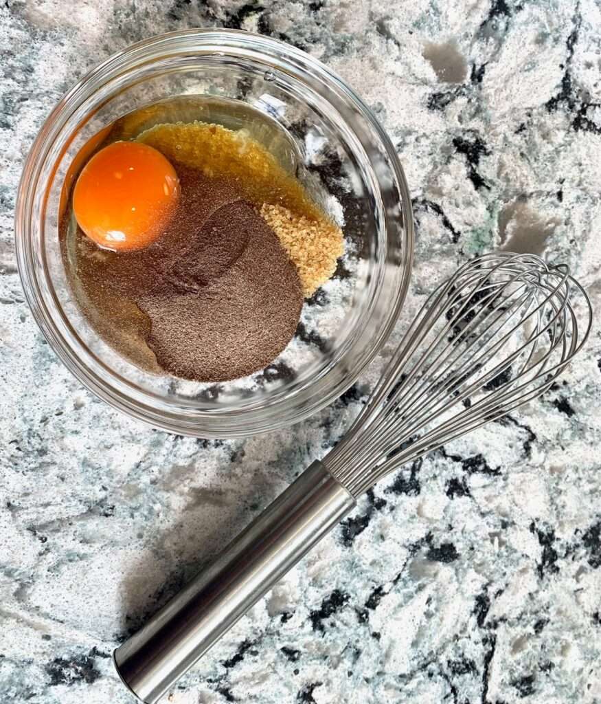 Add sugar, cocoa powder, and egg until melted.