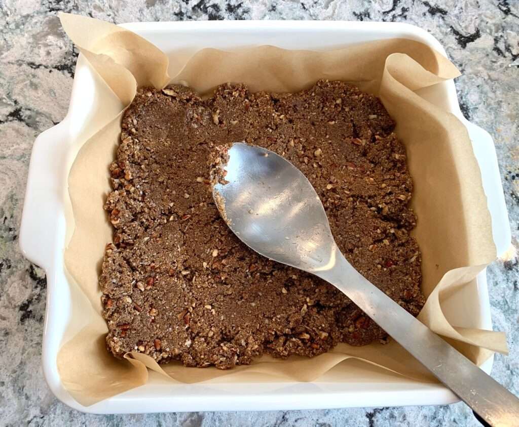 Firmly press mixture into the square baking pan. Make sure it is pressed into an even layer. Refrigerate for at least 15 minutes.